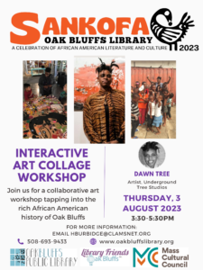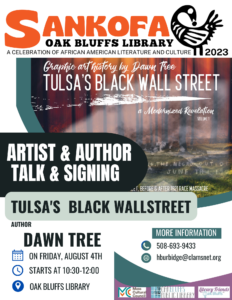 Dawn Tree Artist & Author Talk : Tulsa’s Black Wall Street Friday, August 4 11:00 – 1:00pm Join us for an artist & author talk with Dawn Tree. Dawn will talk about her graphic novel, Tulsa’s Black Wall Street: A Modernized Revelation as well as the art she is showing during the Sankofa Festival in the Oak Bluffs Library’s meeting room. About the Book: Tree’s book discusses the 1921 Race Massacre and brings the history to life via botanical images of nature, archived photos and her journalistic artistic imagination from before, during, and after the 1921 Race Massacre that shook Tulsa, Oklahoma. |
