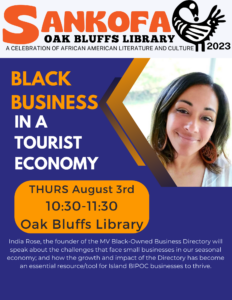 Black Business in a Tourist Economy Thursday August 3 10:30 – 11:30 India Rose, the founder of the MV Black-Owned Business Directory will speak about the challenges that face small businesses in our seasonal economy; and how the growth and impact of the Directory has become an essential resource/tool for Island BIPOC businesses to thrive. |