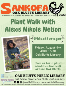 Join us for a Plant Walk starting at the Oak Bluffs Library with Alexis Nikole Nelson aka @blackforager. This walk and discussion will focus on foraging and plant identification of species found in Oak Bluffs. Alexis Nikole Nelson is an American forager, cook, and internet personality. She maintains the TikTok account alexisnikole and Instagram page blackforager, where she posts videos of her foraging finds along with cooking techniques and historical informationFriday, August 4 4:00 – 5:30pm |