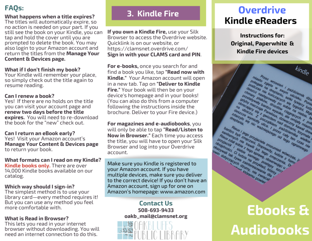 Kindles: print PDF instructions for downloading onto your Kindle device (Done through your internet browser on the Overdrive website and then delivered to your Amazon account and then delivered to your device.)